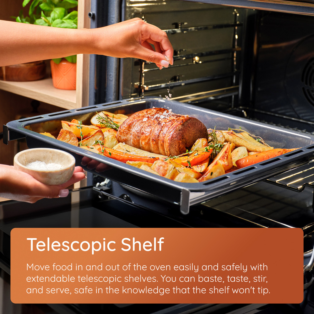 An extendable shelf that is self-supporting so you can take dishes in and out, taste or stir, safe in the knowledge that the shelf won't tip. Each oven that shelf won't tip. Each oven that has a telescopic shelf also has a telescopic shelf also comes with a deep dish.