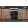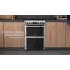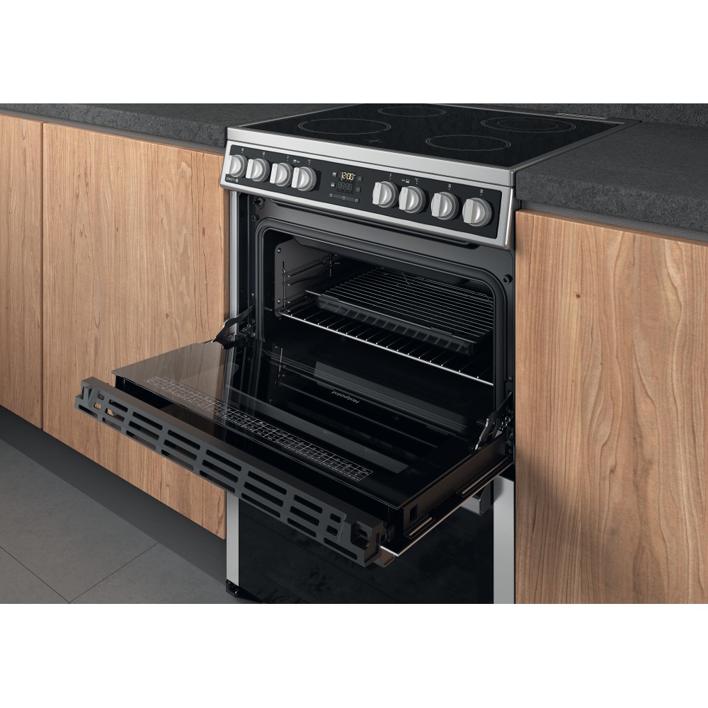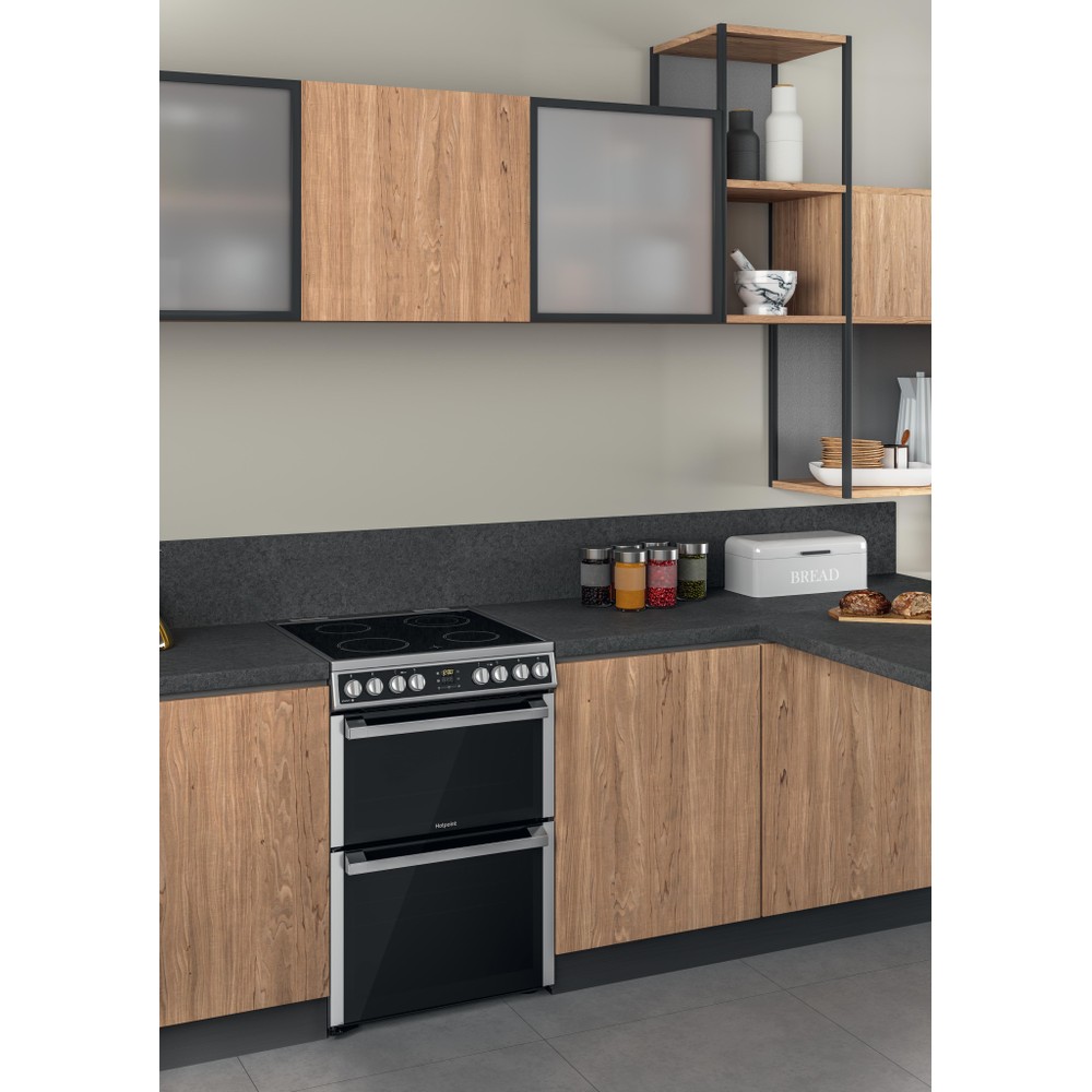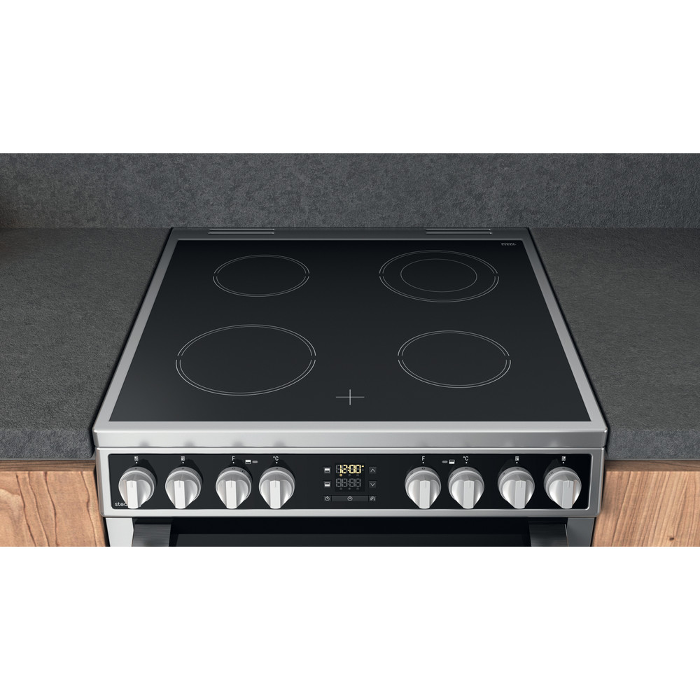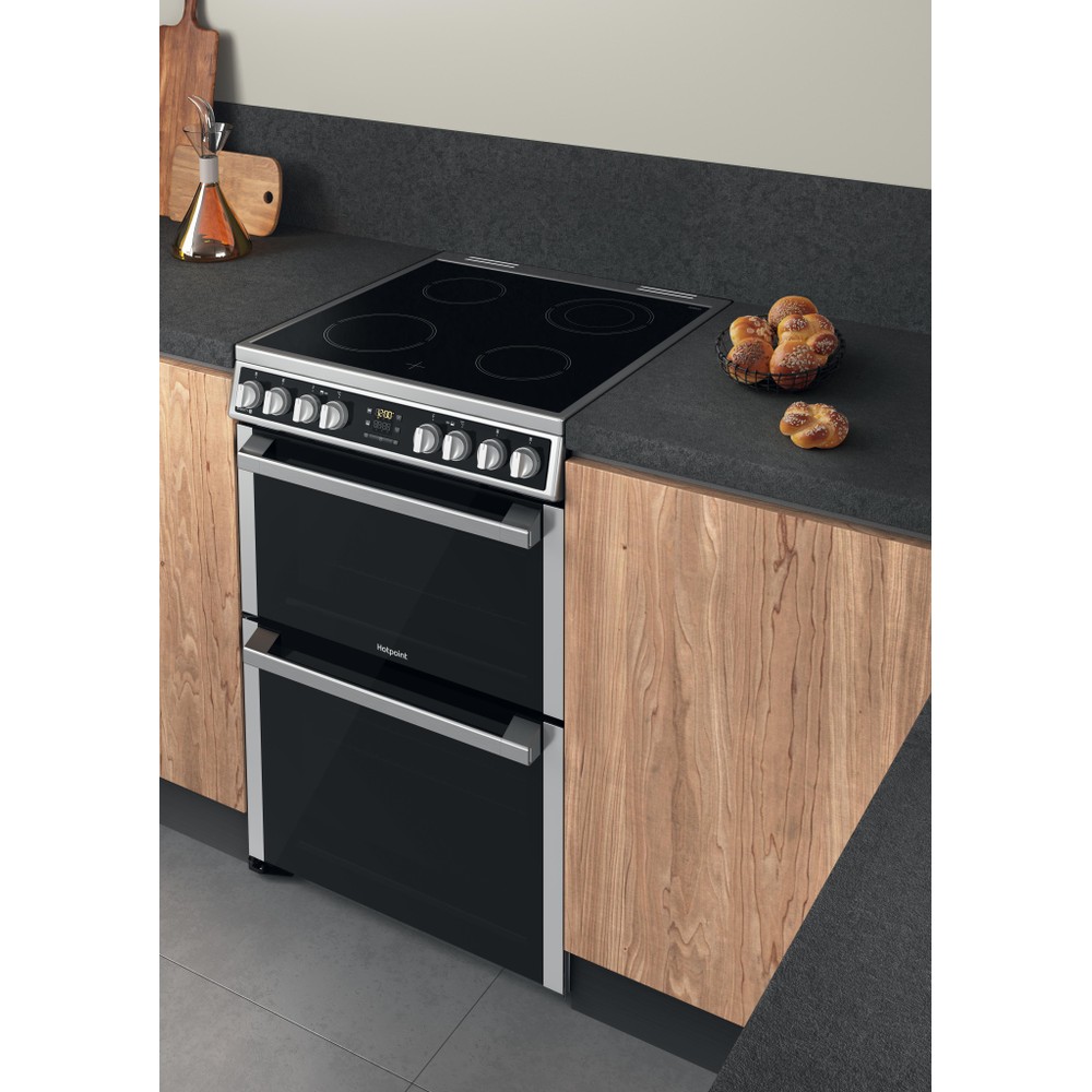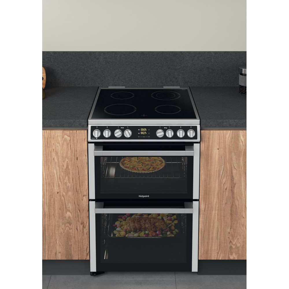 This Hotpoint freestanding 60x60 double cooker features: 4 radiant plates. Inox colour. Electric power supply. Multi function cooking method. 60cm width.