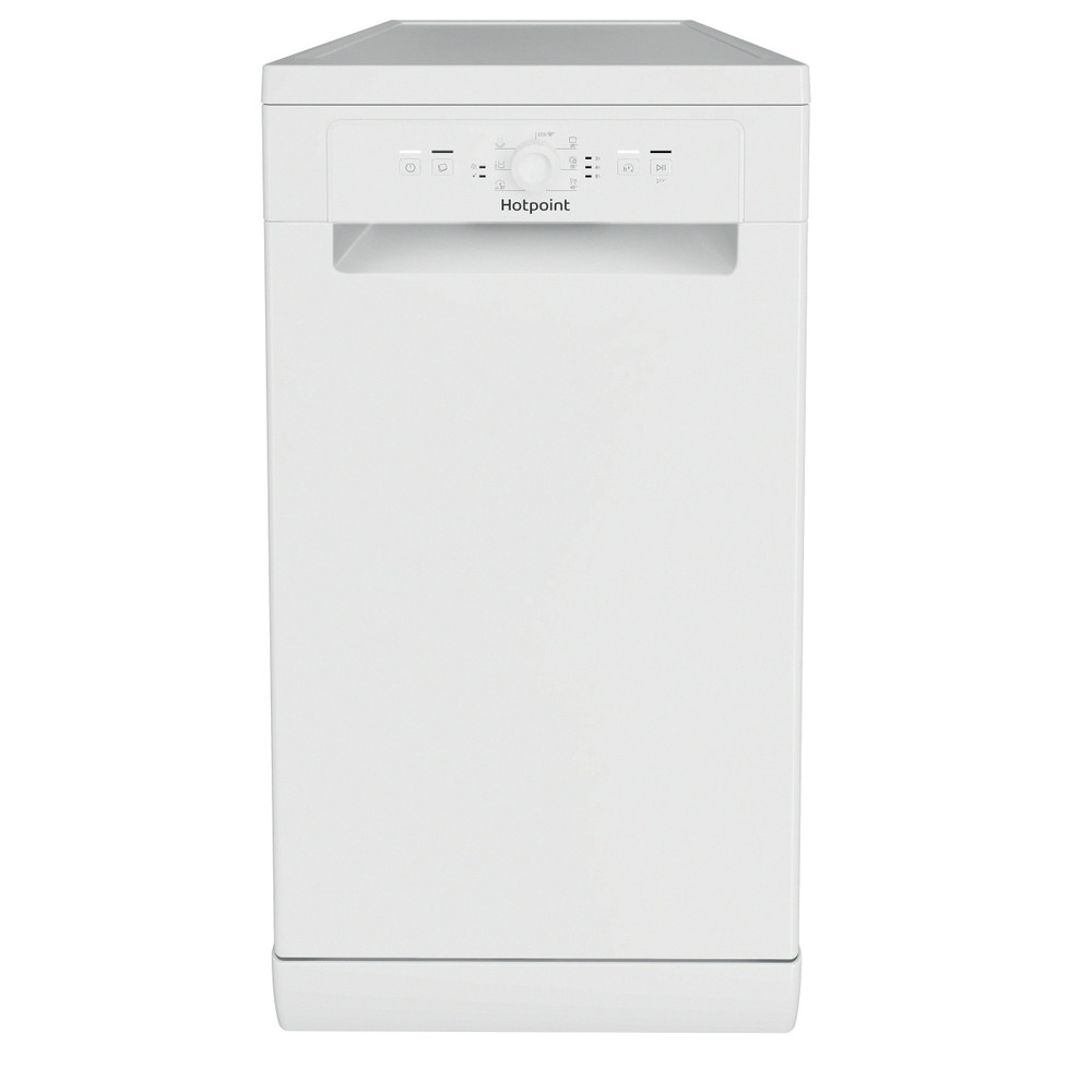 Get the same dishwashing power in a compact space. This slimline Hotpoint freestanding dishwasher in classic white has room for up to 9 place settings, making cleanup a breeze. The adjustable baskets also offer extra flexibility, so you can easily fit large items like tall wine glasses or mixing bowls. When you need your dishes quickly, the Rapid Wash cycle cleans a small load of lightly dirty dishes in just 30 minutes.